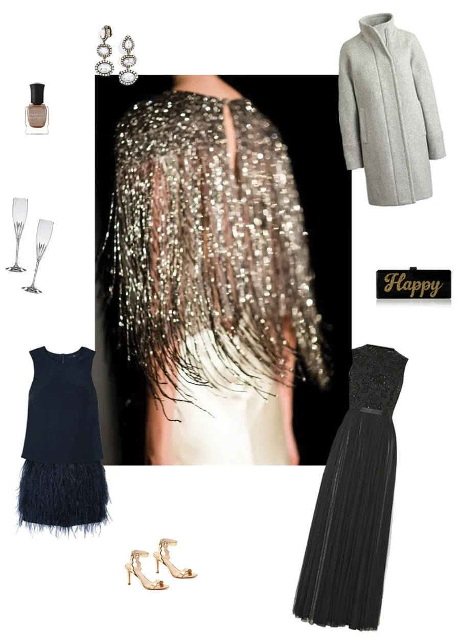 Deborah Lippmann Nail Polish - Bauble Bar Statement Earrings - J.Crew Grey Wool Jacket - Edie Parker Happy Clutch - Black Gown - Loeffler Randall Gold Heels - Tibi Navy Fringe Dress - Champagne Glasses