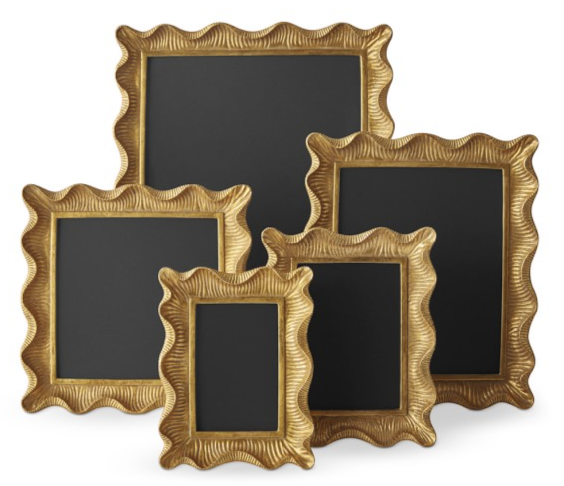 Bottom: Gold Scalloped Gallery Frames, Sea Blue Geometric Platter, Carved Terracotta Vase, & Handpainted Tile Cachepot.
