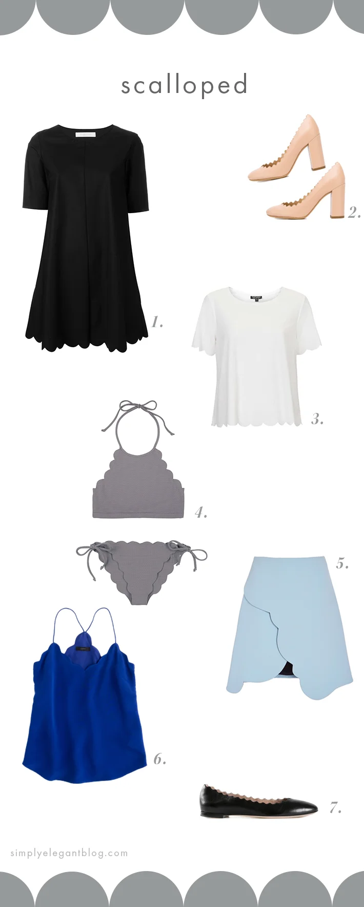 I think that a scalloped edge should always be a detail on a solid piece, a scalloped edge on a pattern seems a bit too juvenile or preppy for my preference. But a dress in solid black or white with the extra subtle detail on the hem, is just beautiful!