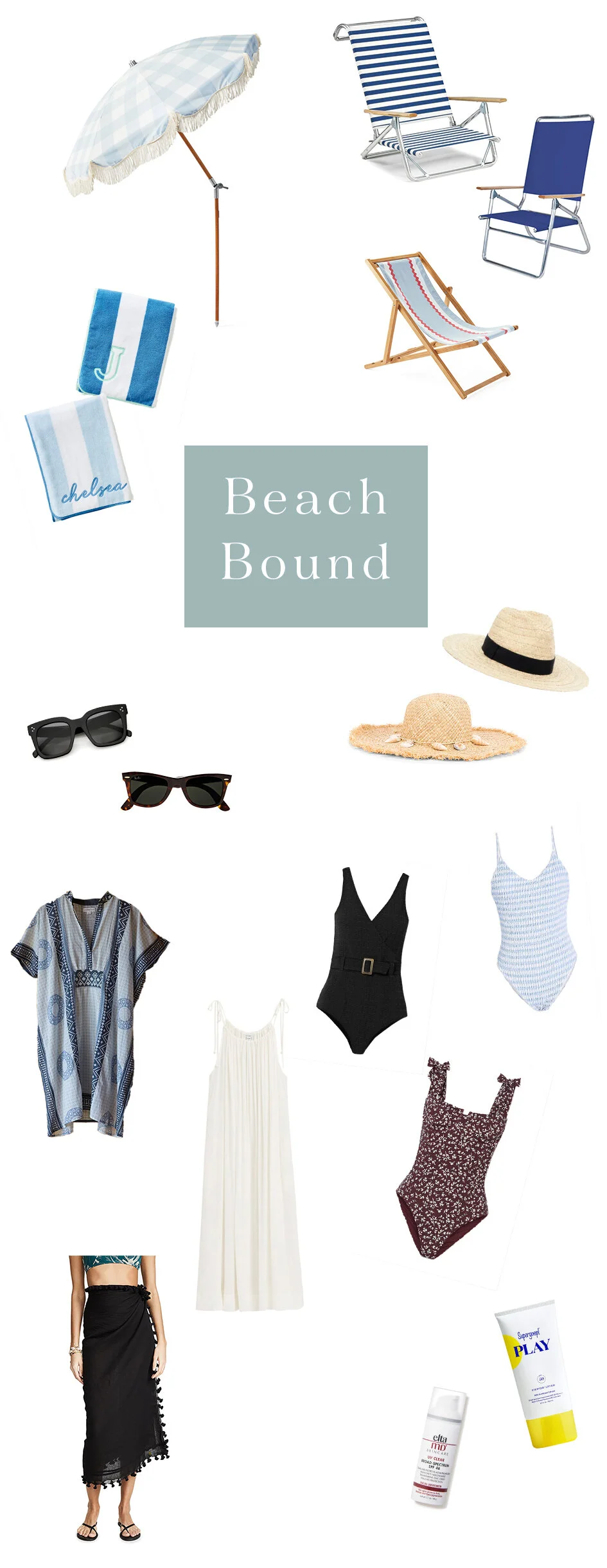 1. Stripe Beach Towels from Weezie (We have the a few of the Royal Blue at our house!) 2. Beach Umbrella from Serena & Lily x Business & Pleasure 3. Blue & White Stripe Beach Chair from Telescope Casual 4. Cobalt Beach Chair from Telescope Casual (Just ordered 2 of these!) 5. Sling Chair from Serena & Lily 6. Daily Fedora with Black Ribbon from Hat Attack 7. Seashell Straw Hat from Hat Attack I have this hat and love it! (on sale for $84!) 8. Black One Piece from Lisa Marie Fernandez 9. Blue & White Gingham One Piece 10. Burgundy Patterned One Piece from Ganni 11. Play Sunscreen (Spf 50) from Supergoop 12. UV Clear (Spf 46) from Elta MD (I wear this daily!) 13. Black Sarong from Roller Rabbit 14. White Maxi Coverup from Cuyana 15. Blue Short Caftan Coverup from Emerson Fry 15. Wayfarer Sunglasses from Ray-Ban 17. Sunglasses from Amazon (Celine dupes!) for only $13